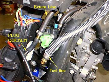 After the torx head screw has been removed, remove the little steel clip under it. Now you have to unplug your fuel lines. One is the intake from your fuel pump, and one is the return line. No gas will come out of youor intake line. But gas will POUR out of the return line. I used a small piece of rubber hose, and plugged one end with a bolt. As soon as I pulled the return line off, I pushed the hose onto the connector. You may also just want to drain the gas into a gas can, the choice is yours.