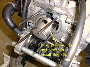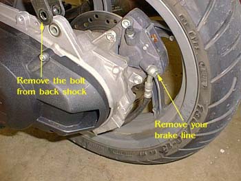Unbolt the rear shock from the transmission housing, and unbolt youor rear brake line. Be sure to remove the two bolts that hold the brake line up under the tranny cover also. Keep the brake line held above your brake fluid reservoir to prevent it from draining out.