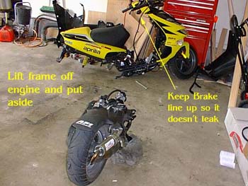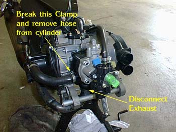 Remove the spark plug wire. And if you are ABSOLUTELY SURE there is nothing else connected to your engine, then remove the main chassis bolt from the frame. This may require two people to lift the frame off the engine. I was able to do it by myself, but it wasn't easy.