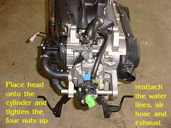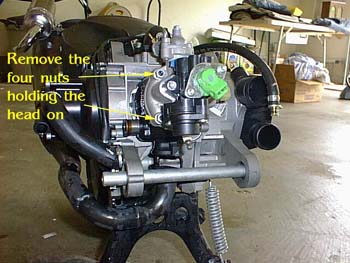 Now everything should be completely disconnected from the cylinder and head. Remove the four nuts that hold the head and cylinder on.
