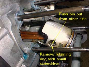 Now, use a small scewdriver or a pair of needle nose pliers and remove the ring clip from one side of the piston. Push the connecting pin through from the other side to remove the piston.