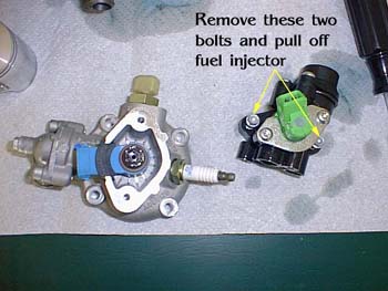 Start by removing the two bolts that attach your fuel injector to the head and remove the fuel injector.
