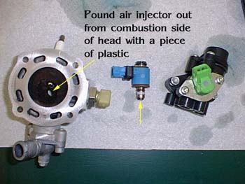 Next you need to pound your air injector out of the head... Yes I said ound it out. It is pressed in the head. Flip the head over and use a small piece of plastic to pound the injector out from the combustion side.