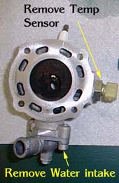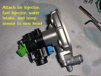Cut off the aluminum washer on the temperature sensor and replace it with the new one provided in the kit. Attach everything to the new head. DO NOT TIGHTEN THE TEMPERATURE SENSOR YET. There is not a lot of room with the new cylinder. You have to wait until everything is back together and tighten it so you can plug your connector on. If you tighten it now, you may not be able to get your connector back on, and you can't loosen it after the washer is squished or it will leak!