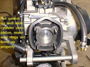 Now you need to put the cylinder on. Start by using a little 2-cycle oil and lubricate the walls of your cylinder. Also, there are bolt studs that came with your kit, these are for your exhaust. Use your old cylinder to determine which length you need, and screw the short end of the post into the cylinder by your exhaust port. I only require one in mine, but there were two in the kit. Put the gasket provided with your kit onto the four bolt posts and slide it down to the motor. Push the cylinder onto the four bolt posts and push it down just until the top of the piston starts to enter the cylinder. Line your ring up with the little pin in the groove on the piston and squeeze the first ring together and push the head down to the second ring. Then do the same for the second ring and push the cylinder all the way down to the motor.