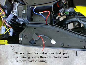 Disconnect the battery and remove it. There is a connector that attaches to the fuses underneath the faring. Disconnect it to remove the fuse block.