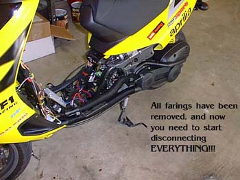 OK, after you have pulled the wires through and removed your last faring, it is now time to start disconnecting ALL WIRE CONNECTORS, HOSES, AND CABLES from the engine. This is what you should have now.