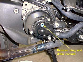 Now disconnect your oil line for your 2-cycle oil. Also there is a breather to help your coolant drain. Remove this scew to help your coolant drain out of the cylinder.