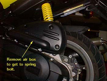 Ok, you will also need to remove your air box to get to the bolt holding your rear shock on. Also remove the connector from your throttle body at this time. (That is the connector that is located on the intake right behind the air box.)